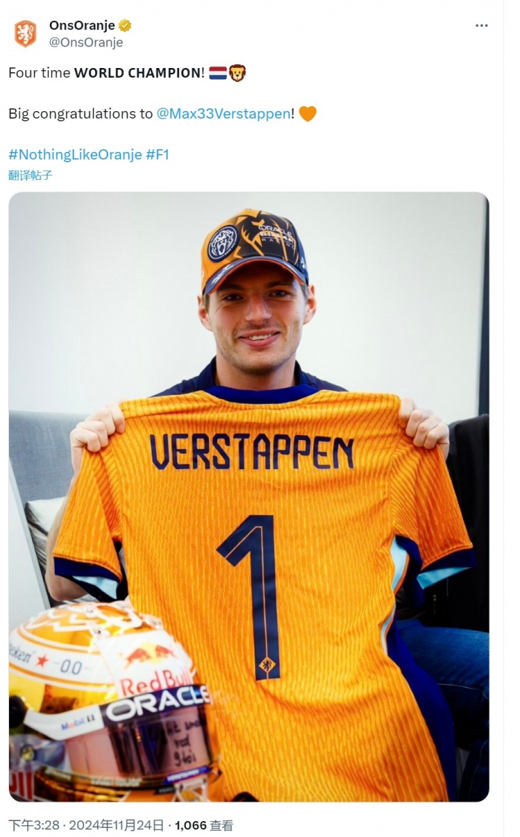 維斯塔潘加冕F1四冠王,荷蘭隊官方社媒發文祝賀