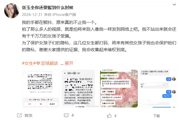 一位微博名為“張玉全你還要躲到什么時候”的女子上個月在社媒發(fā)文痛斥張玉寧的弟弟張玉全(現效力于深圳新鵬城U21)。該女子稱張玉全不顧雙方意愿強行發(fā)生關系,查出懷孕后不負責玩消失。除了當事人張玉全,她在還在社媒@了張玉寧和張全成。