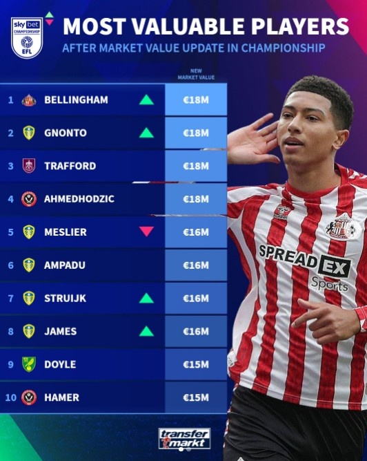 英冠球員身價前10:喬貝-貝林厄姆1800萬歐并列第一