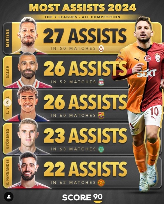 12月31日訊 score90統計了歐洲前7聯賽各項賽事2024年助攻榜,加拉塔薩雷前鋒默滕斯27次第1,薩拉赫、亞馬爾26次第2。歐洲前7聯賽2024年助攻榜:1,默滕斯:50場27助2,薩拉赫:5